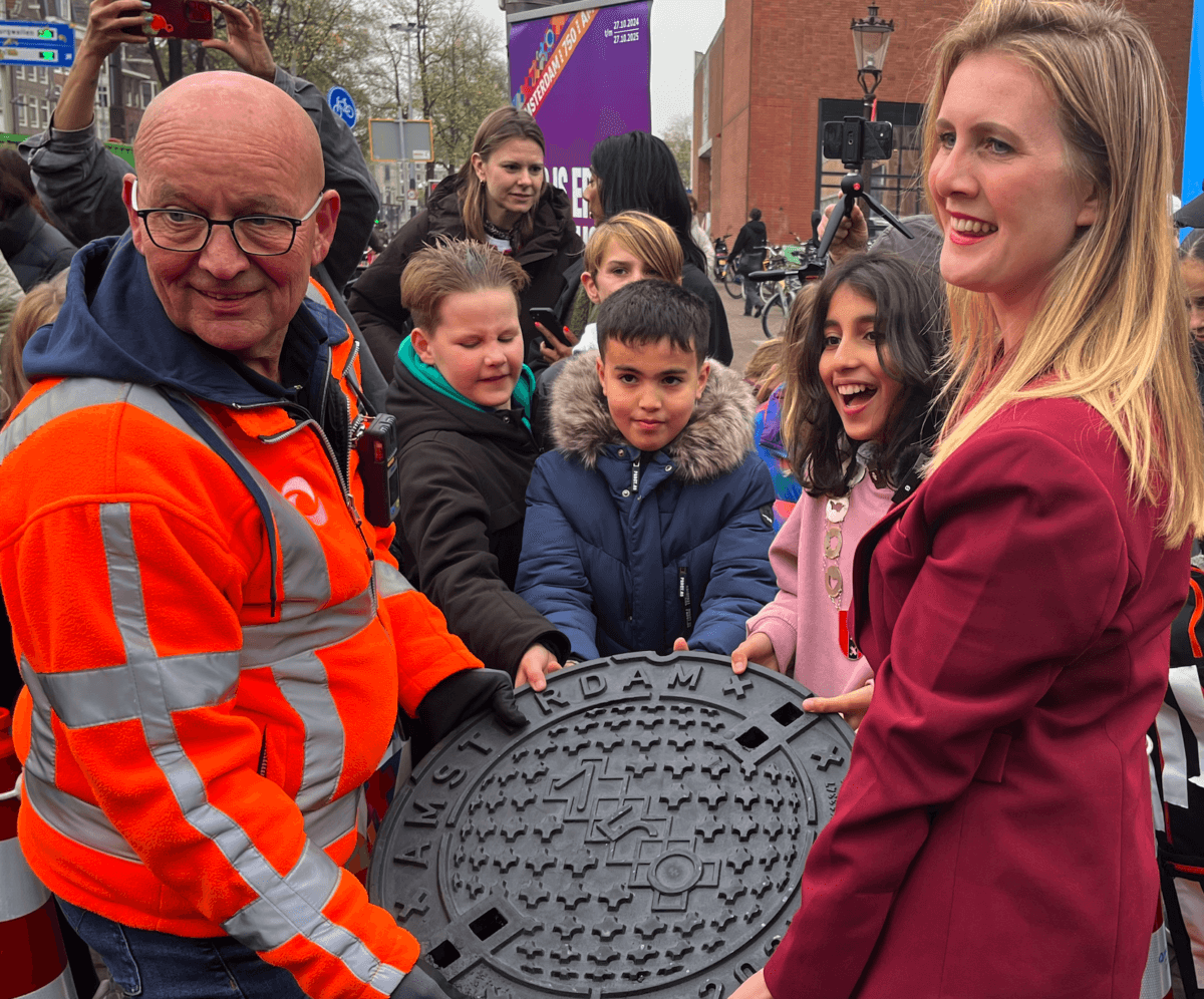 Om dit historische jaar te vieren, ontwierp kunstenaar Alex Fischer – bekend om zijn kunstwerken van putdeksels wereldwijd – een unieke Amsterdam 750 putdeksel. Samen met wethouder Van der Horst, kinderburgemeester Rüya en de kinderen van de kinderraad, onthulde hij op woensdag 6 november het eerste exemplaar door een bijzonder kunstwerk te maken. Dit ontwerp is veel meer dan alleen een versiering; het symboliseert de infrastructuur die onder onze voeten ligt en waarmee Amsterdam al eeuwen in beweging blijft.