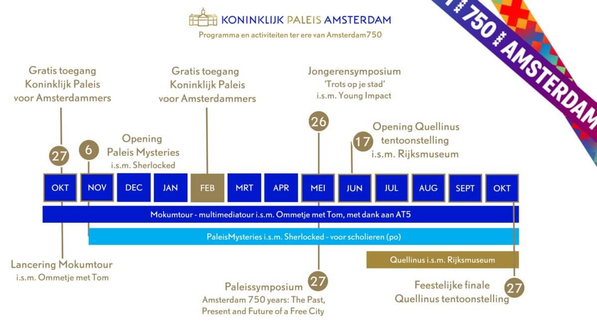 Het Koninklijk Paleis Amsterdam speelt al eeuwenlang een belangrijke rol in de geschiedenis van Amsterdam. Daarom vieren zij de 750ste verjaardag van de stad met een uitgebreid programma vol activiteiten. We geven je een overzicht van alle jubileumactiviteiten in het Koninklijk Paleis Amsterdam.