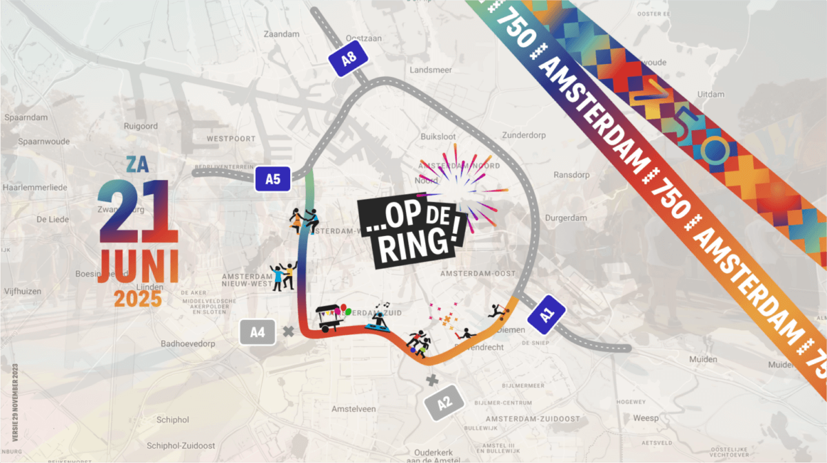 Op zaterdag 21 juni 2025 vieren we de 750ste verjaardag van Amsterdam op 15 kilometer autoloze Ring A10, met muziek, sport, theater, dans & nog veel meer!